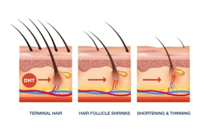 Il existe généralement trois facteurs impliqués dans la calvitie masculine. La prédisposition à la perte précoce des cheveux, l'âge et un excès de testostérone convertie en DHT, la DHT étant le principal androgène impliqué dans la calvitie masculine. Environ 95 % de la perte de cheveux et de la calvitie éventuelle chez les hommes sont causées par un excès de DHT. La DHT détruit l'apport sanguin aux follicules pileux.